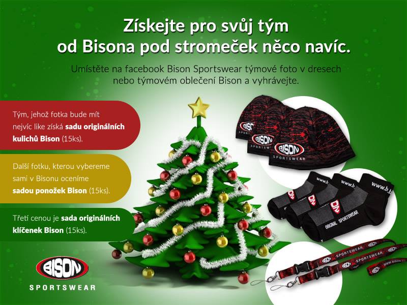 Dej svému týmu dárek pod stromeček! Stačí přidat na facebook Bison Sportswear foto týmu v dresech nebo týmovém oblečení Bison a může to být právě tvůj tým, který získá jednu ze tří cen.