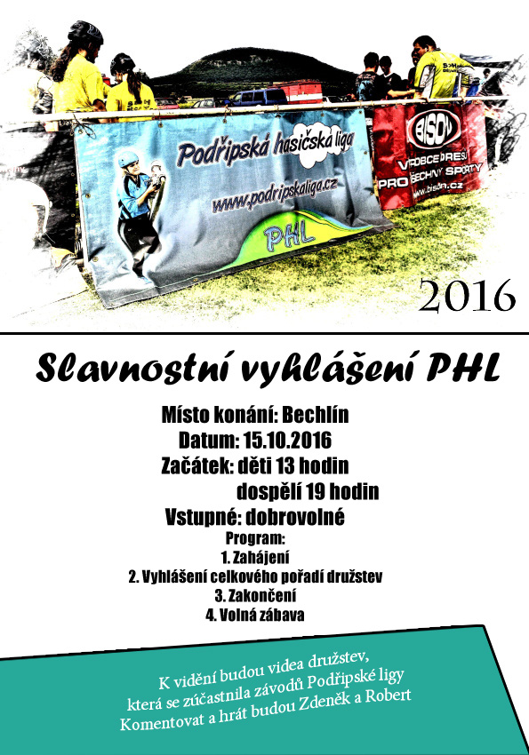 Dne 13.11.2016 bude od 14 hodin schůze Podřipské hasičské ligy v Nových Dvorech na sále. Smyslem této schůze je naplánovat a zlepšit závody PHL pro další ročník.